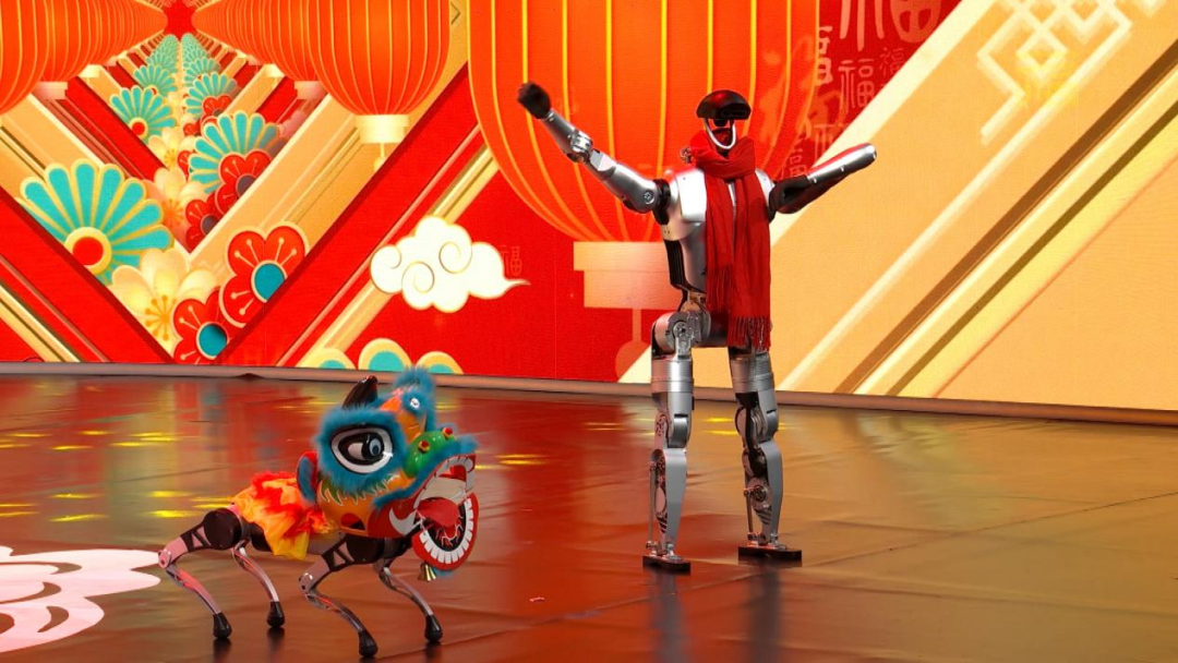 科技赋能,古今碰撞,呈现双重美感。开篇歌舞《奔腾齐鲁过大年》节奏欢快、旋律昂扬,智能机器人“行者泰山”与舞蹈演员默契共舞,机械韵律与民俗舞步碰撞出别样火花。