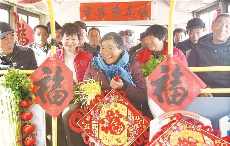 图为2月13日,文泉村的村民赶年集后乘坐爱心“年集公交车”回家。