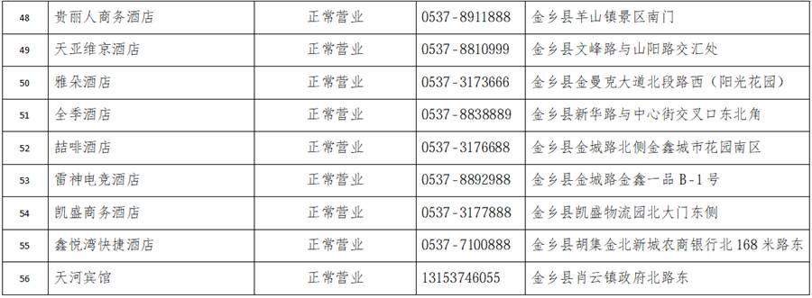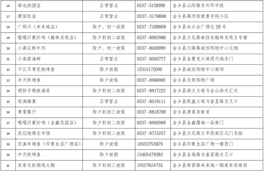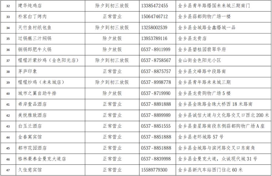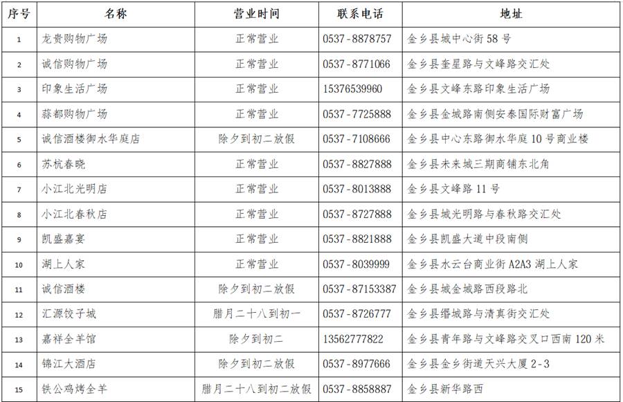齐鲁网·闪电新闻2月17日讯 为方便外地游客及本地市民购物、餐饮、住宿、娱乐等消费,金乡县文化和旅游局梳理了春节期间金乡县部分大型商场、餐饮、住宿场所的营业时间和联系方式,广大市民游客注意收藏。