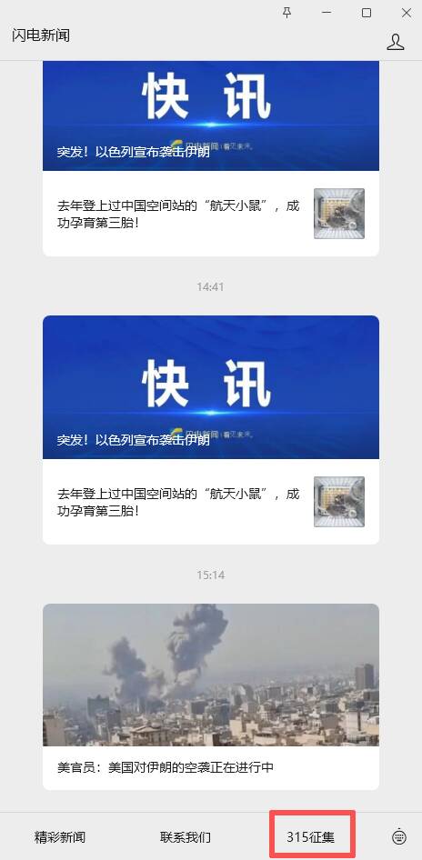 2、关注“闪电新闻”微信公众号,点击下方“3·15征集”按钮参与。