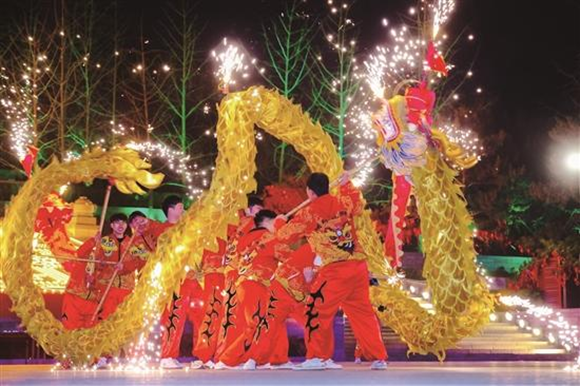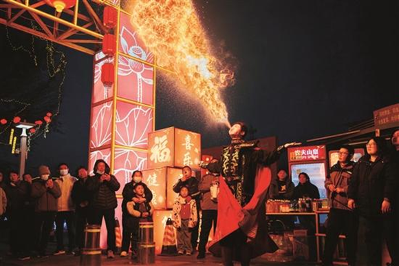 鲁源村的“花火鲁源·回村过年”活动同样热闹。“浮光琉璃台”上演社火大秀,中幡、英歌舞、川剧变脸、高跷等民俗表演轮番登场,龙船游弋于灯火水面,让游客沉浸式感受齐鲁大地浓郁年味。