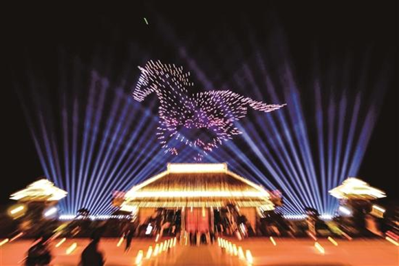 在兖州牛楼小镇,当五彩的烟花冲向夜空,瞬间炸裂成满天繁花,点亮了小镇的夜空,也映红了每一张仰望的脸庞。鱼台县的孝贤庙会上,“风火轮”打铁花技艺惊艳亮相,熔化的铁水被奋力甩出,金花四溅、流光溢彩;与此同时,数百架无人机凌空起舞、变换造型,在苍穹之上绘就龙凤呈祥等吉祥图案,为现场观众带来一场震撼人心的视觉盛宴。
