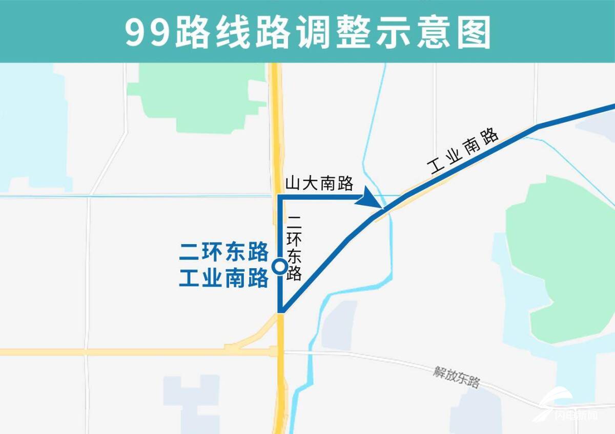 99路由谢家屯开往二环东路工业南路,优化调整后沿工业南路向西、二环东路向北、山大南路向东至工业南路向东恢复原线,沿途增设地铁山大南路东口站站点。