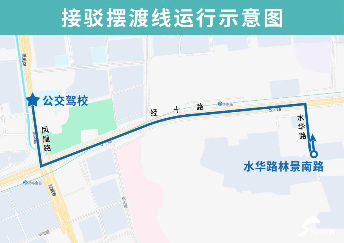 接驳摆渡线由公交驾校开往水华路林景南路,主要途经凤凰路、经十路、水华路,沿途设置公交驾校、中心医院东院、地铁林家庄站、经十路水华路、水华路林景南路站点。