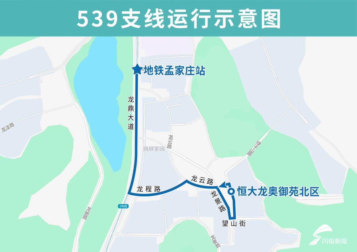 539支线由地铁孟家庄站开往恒大龙奥御苑北区,主要途经龙鼎大道、龙程路、龙云路,然后单向沿龙景路向南、望山街向东、社区道路向北再向西至龙云路向西恢复原线,沿途设置地铁孟家庄站、锦屏家园、龙程路龙鼎大道、龙洞社区医院、龙景路龙云路(路西)、龙云路龙景路(路北)、恒大龙奥御苑南区(路东)、恒大龙奥御苑北区(路东)站点。