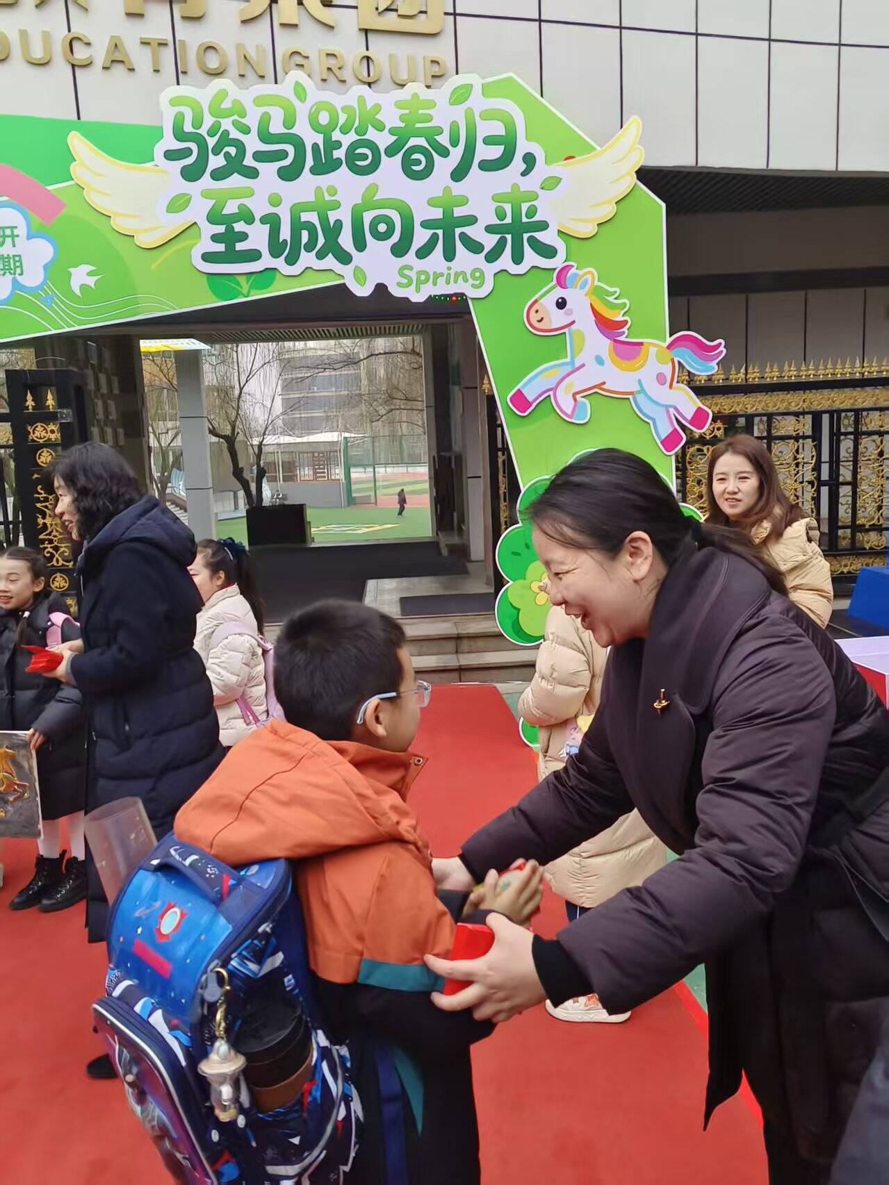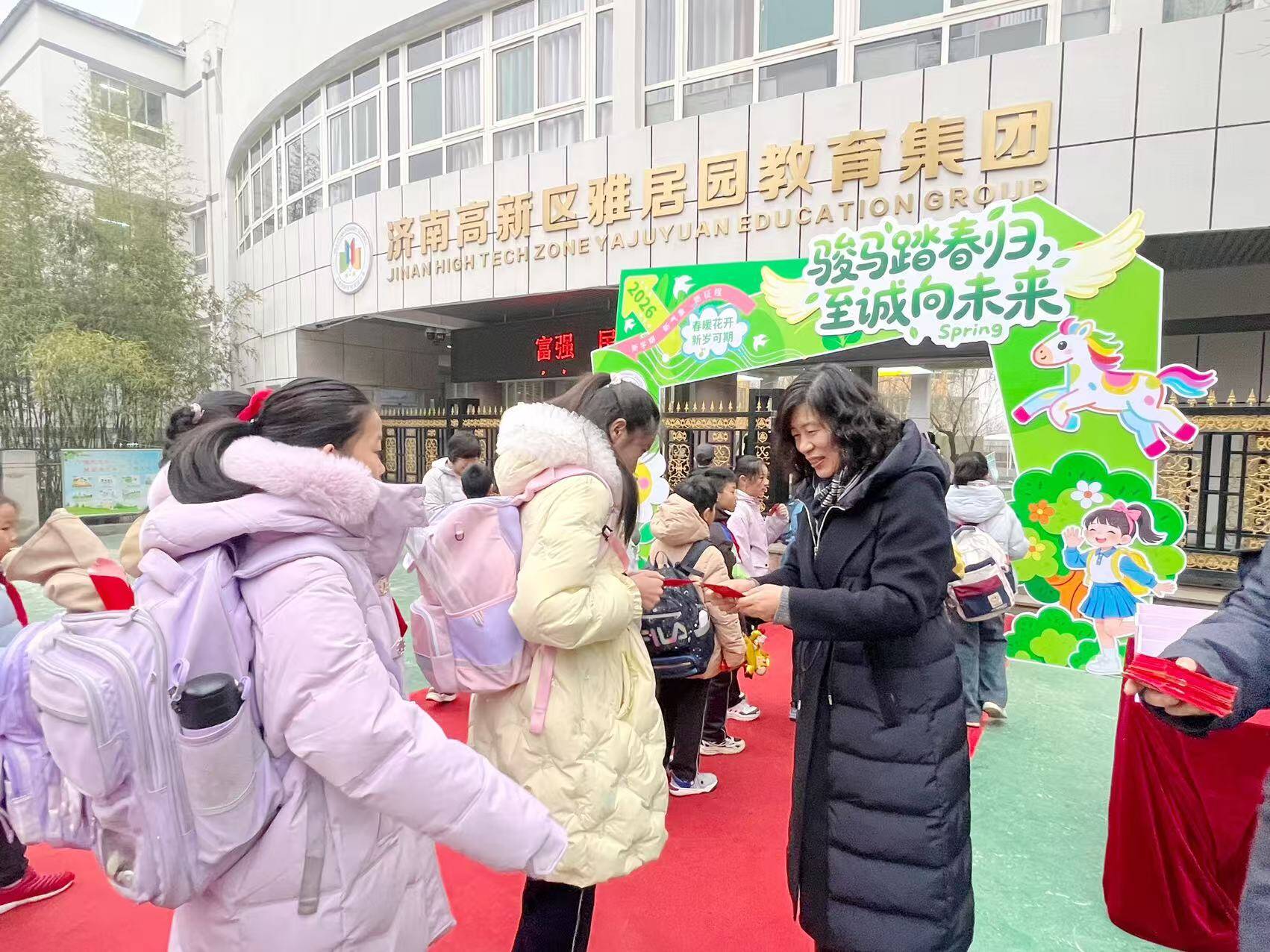济南高新区雅居园小学举行“骏马踏春归 至诚向未来”主题开学报到活动。活动当天,学生可通过身着马元素服饰、背诵与马相关诗词、送上马年吉祥祝福等三选一形式参与。