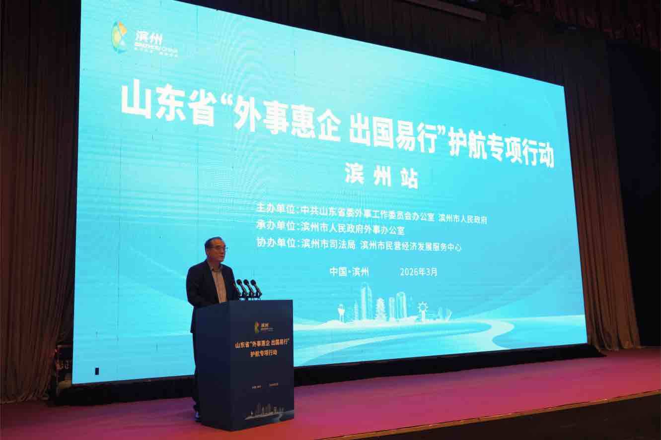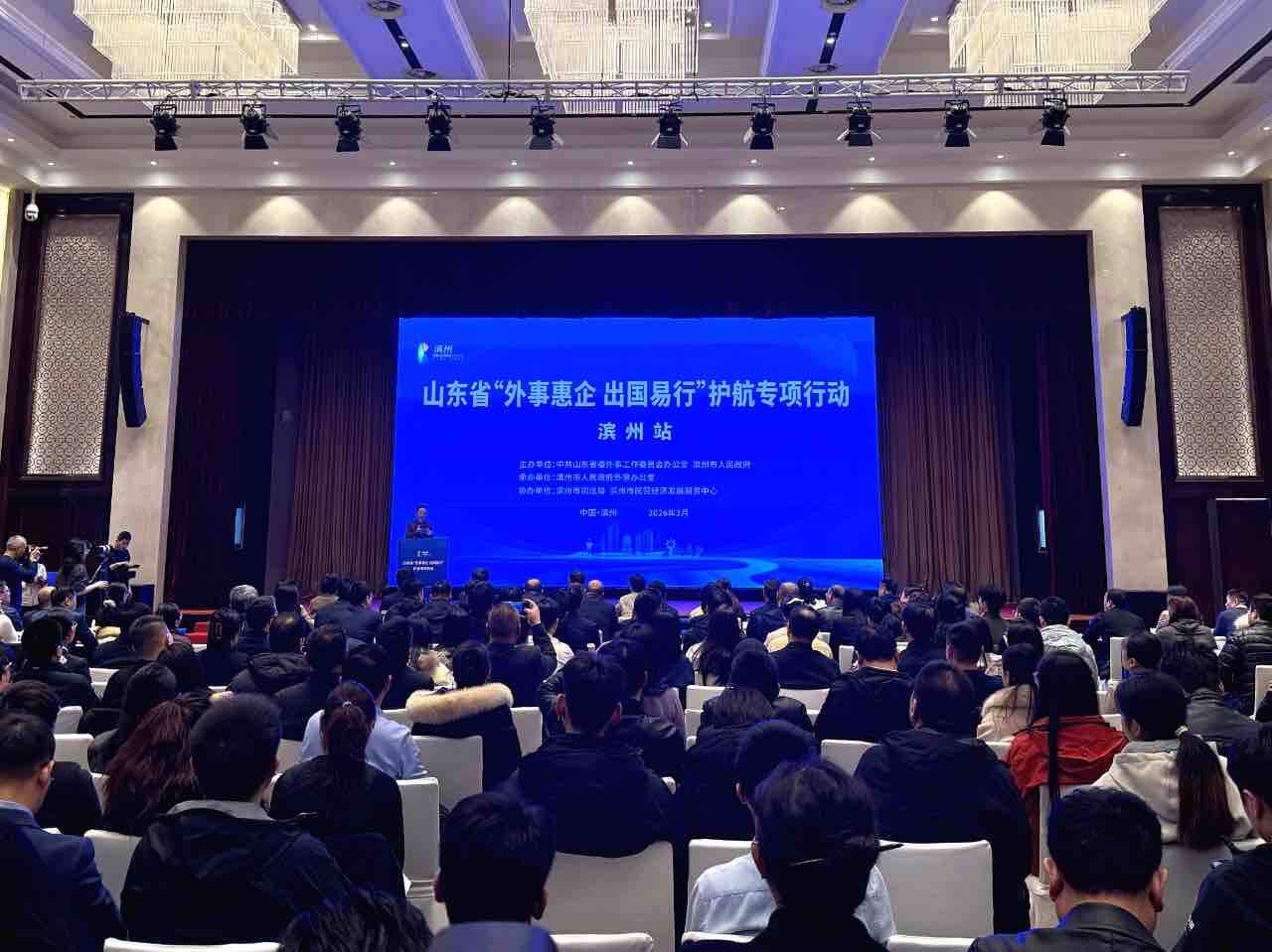 齐鲁网·闪电新闻3月6日讯 为深入贯彻落实省委、省政府“万企出海 鲁贸全球”国际市场开拓行动部署,精准锚定“滨企创世界”工作目标,破解企业“走出去”痛点、难点、堵点,3月6日,山东省“外事惠企 出国易行”护航专项行动在滨州成功举办。本次活动由山东省委外办、滨州市人民政府主办,滨州市外办承办,滨州市司法局、滨州市民营经济发展服务中心协办,活动以政策赋能、资源对接为核心,搭建政企对接桥梁,推动省级优质外事资源下沉,为滨州涉外企业开拓国际市场、实现高质量出海注入强劲动力。
