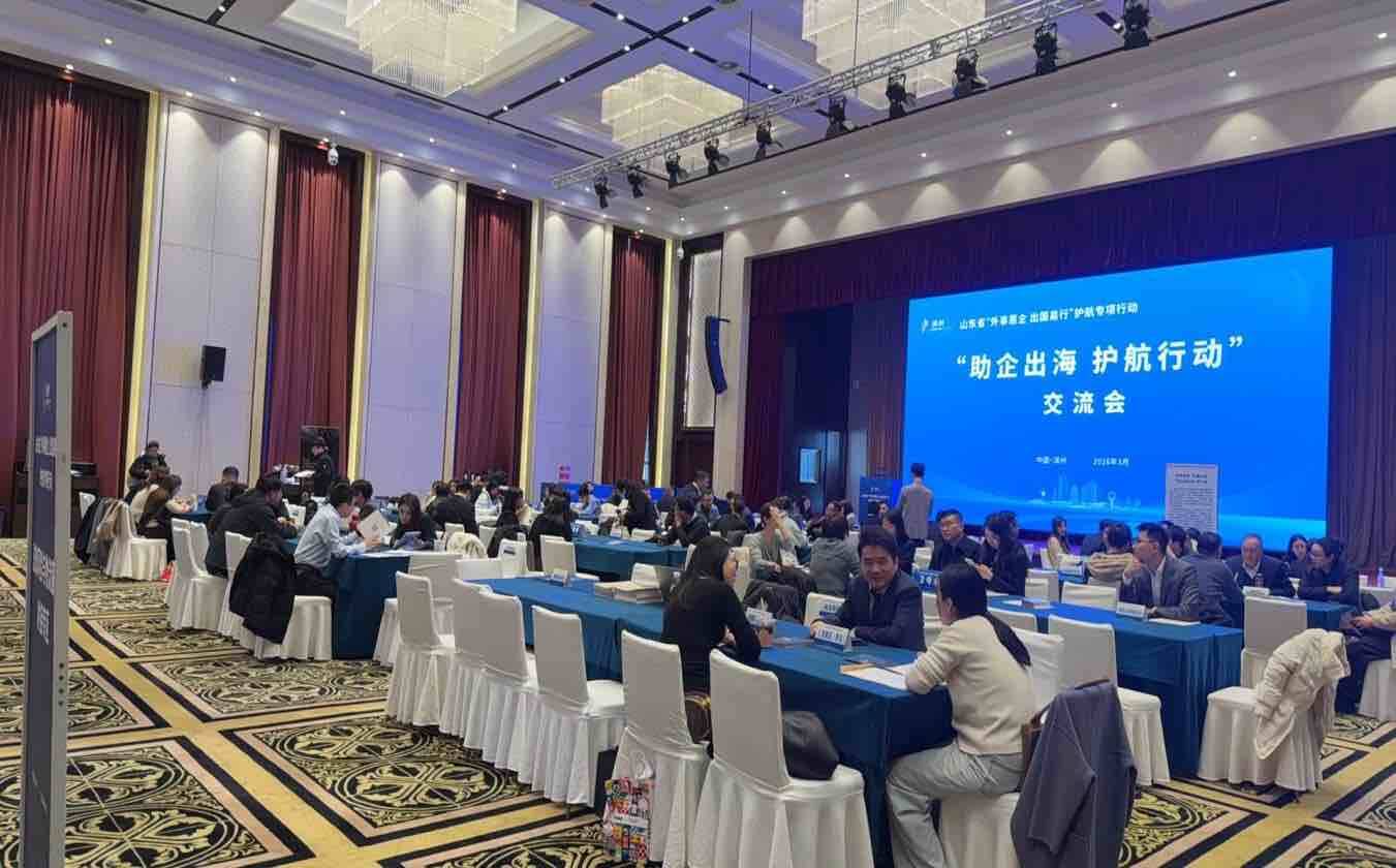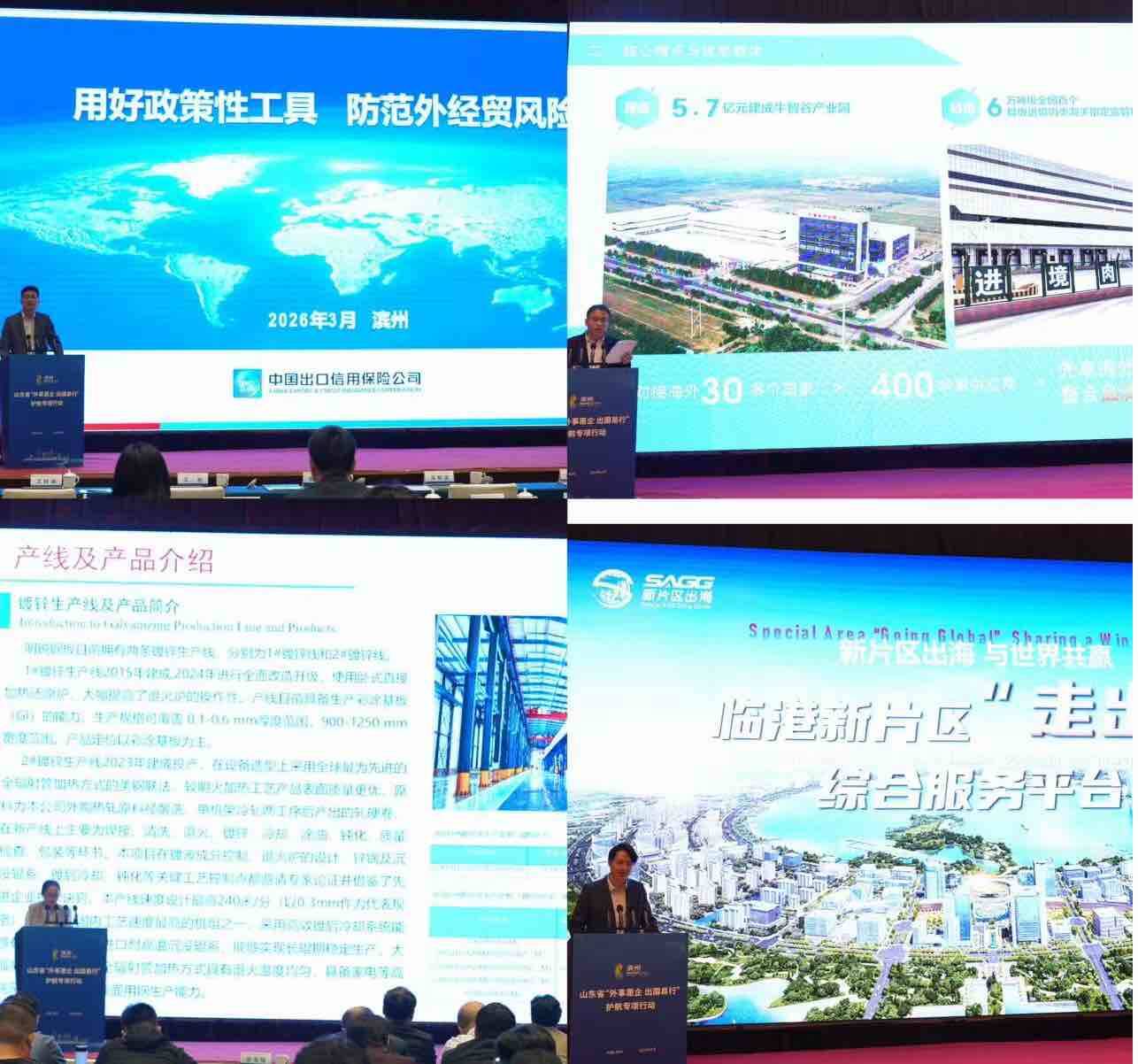 企业出海典型案例分享与服务机构宣介环节,山东滨农科技、牛智谷控股(阳信)等5家出海企业代表,分享了企业开拓国际市场、应对海外风险、深化跨国合作的实战经验,为全市涉外企业提供了可复制、可借鉴的出海样本。上海临港新片区“走出去”综合服务平台、中国出口信用保险公司、泰和泰律师事务所等10家专业服务机构,分别围绕跨境金融、出口信用保险、海外市场拓展、涉外法律维权等领域作服务宣介,为企业出海提供全链条、多维度的服务支撑。