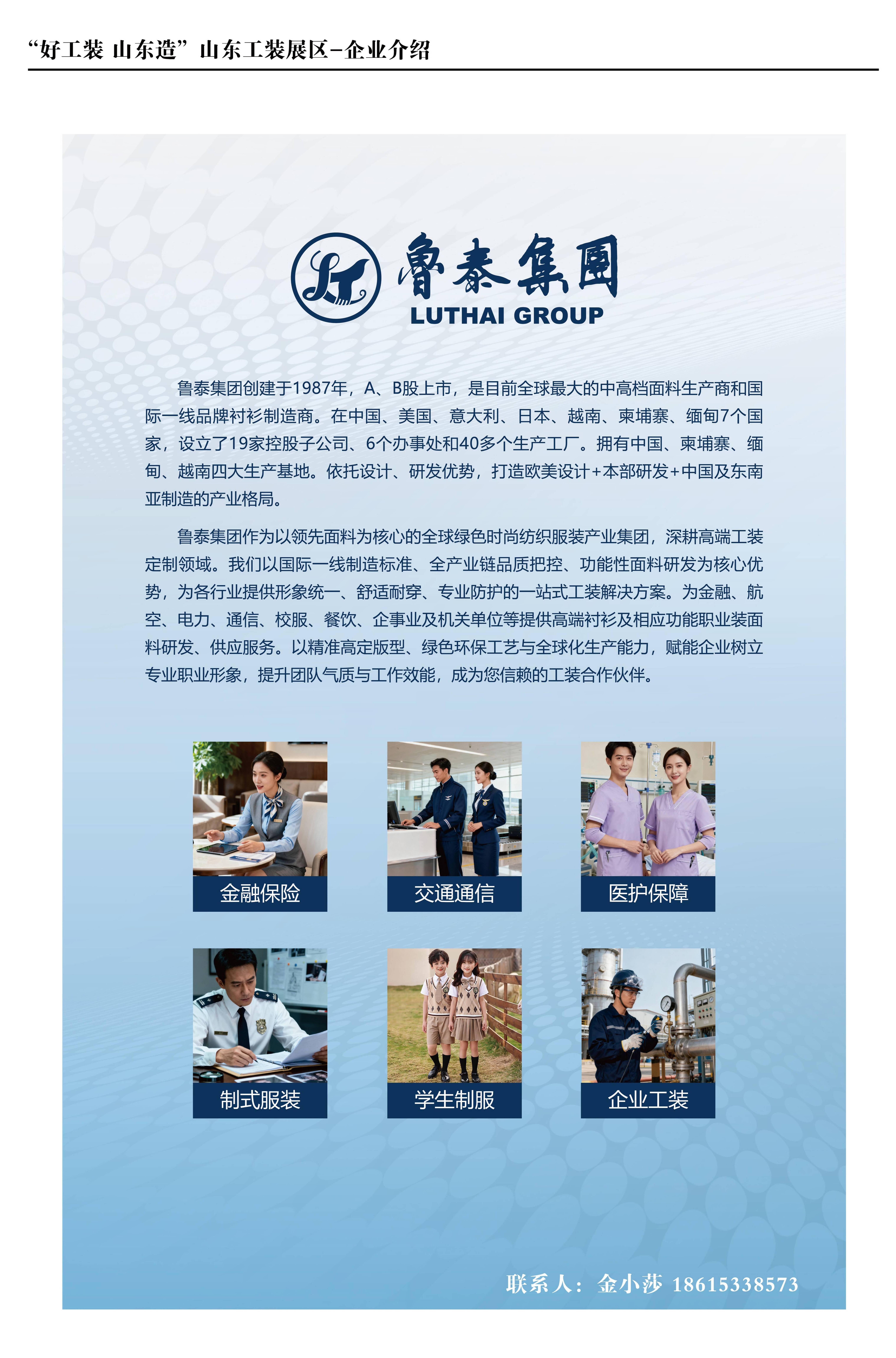 本次“山东工装”主题展区位于国家会展中心(上海)4.1号馆M102展位。展品涵盖职业标志服、专业防护服、职业时装及校园校服等多元品类,应用场景广泛覆盖高危工业制造、能源矿业、交通运输、医疗卫生等典型领域。本次参展将系统展示山东工装产业在研发设计、生产制造及应用解决方案等方面的最新成果,全面彰显“好工装 山东造”的综合实力与创新活力。