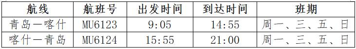 同步运营的青岛至喀什航线(航班号MU6123/6124)计划每周一、三、五、日执飞。去程9:05从青岛起飞,14:55抵达喀什;返程15:55从喀什起飞,21:00返回青岛。