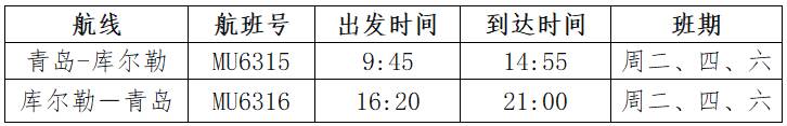 青岛至库尔勒航线(航班号MU6315/6316)计划每周二、四、六执飞。去程航班9:45从青岛起飞,14:55抵达库尔勒;返程航班16:20起飞,21:00返回青岛。