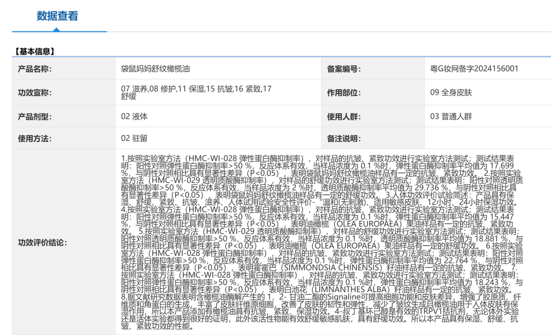 财经生活帮记者登录国家药品监督管理局国产特殊化妆品注册信息查询界面,输入这款产品以及其生产厂家广州天然国度生物科技有限公司(这家企业在2025年11月更名为广东袋鼠妈妈集团有限公司),可以看到企业新名称广东袋鼠妈妈集团有限公司,没有任何国产特殊化妆品注册信息;旧名称广州天然国度生物科技有限公司,有34个国产特殊化妆品注册信息,其中有5个为已批准信息,批准产品涉及的功效有保湿、防晒、舒缓等;其余29个信息状态为正在审批中,其中标注国家药品监督管理局未组织对本产品所称功效进行审核,本注册证不作为对产品所称功效的认可。而且记者挨个进行了核实,这些产品中均未涉及“孕妇和哺乳期妇女适用”的宣传。