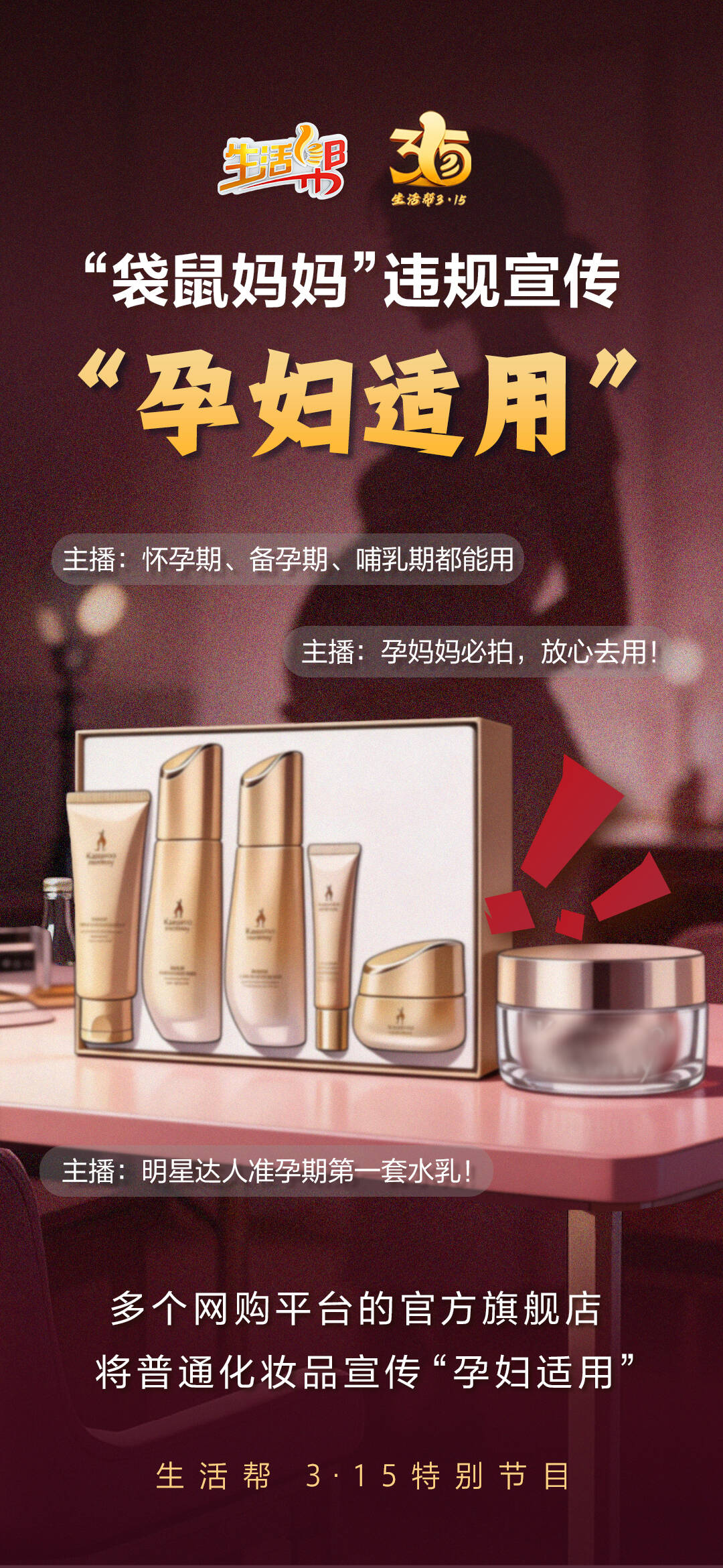 “怀孕期、备孕期、产后期、哺乳期、没有怀孕的都可以用。”“孕妈妈专用专研的。”“适合在孕期里面的新手妈妈去选择的入门级的护肤产品。”在袋鼠妈妈多个网购平台的官方旗舰店,主播均出现了“孕妇适用”相关的宣传。