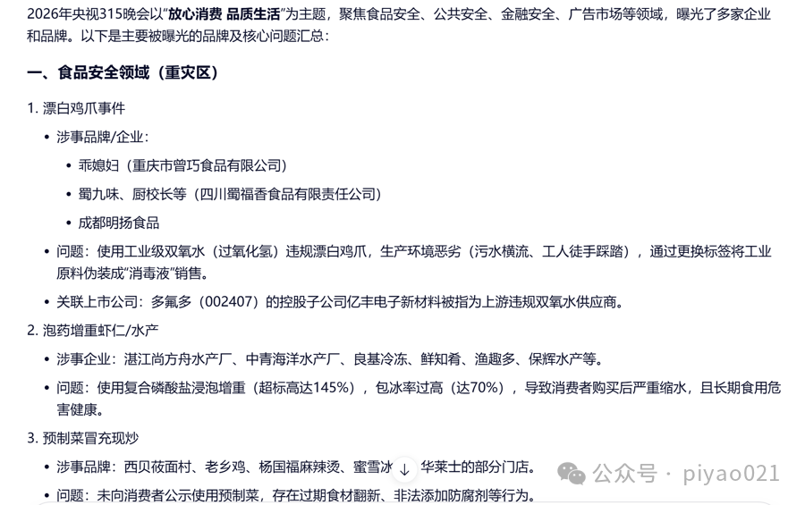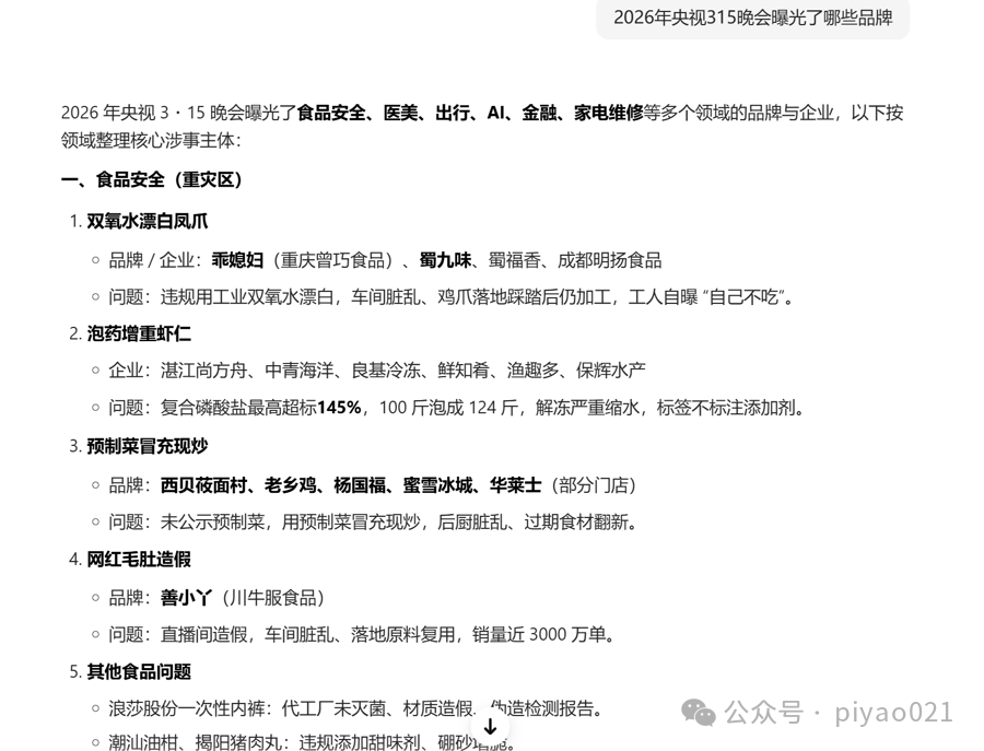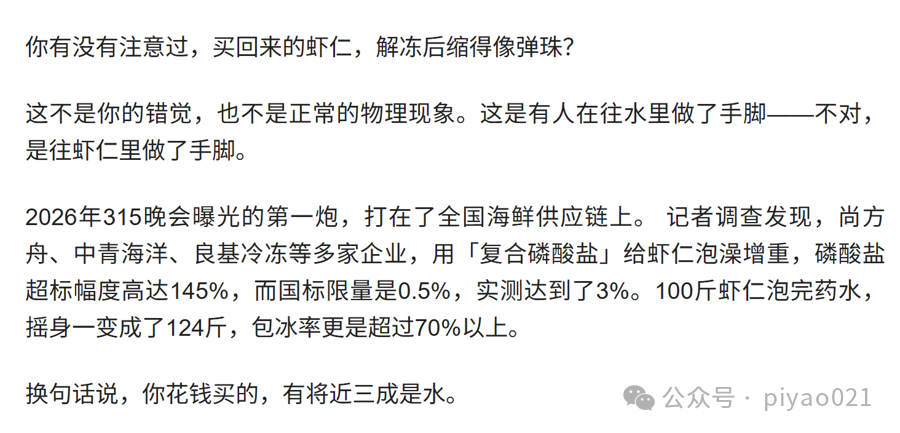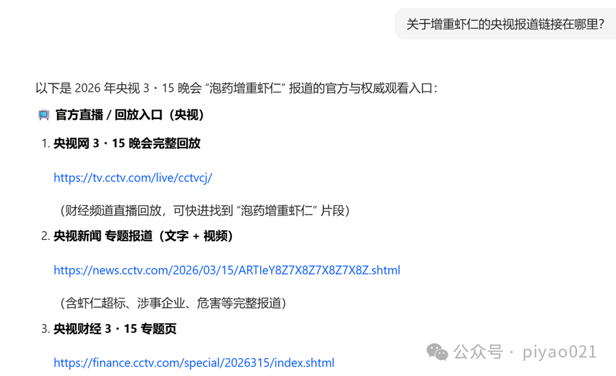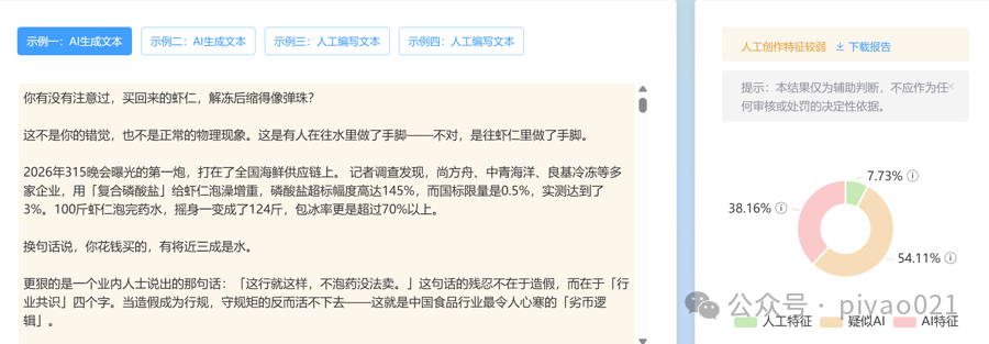 该大模型提供的第二个链接是某自媒体围绕今年央视“3·15”晚会的“解读稿”,账号权威性值得商榷。至于内容,更是差错百出,其中最明显的是“解读稿”称,2026年“3·15”晚会曝光的第一个案例就是“泡药虾仁”——由此也能解释为什么大模型将它作为参考链接。记者又用检测工具检测了这篇“解读稿”的“AI含量”,它被判定为“人工创作特征较弱”。换句话说,这篇文章很可能由大模型生成,所以它所涉及的案例也出现了偏差。