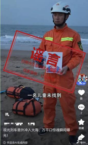 3月17日,某网民在百度平台、“好看视频”平台发布视频“观光列车意外冲入大海,万平口惊魂瞬间曝光!”,视频中称“山东日照万平口景区突发观光列车入海事件,有游客受伤失踪,失联人员含杭州摄影团队、合肥亲子游家庭,具体伤亡数字应急管理局暂未公布,请等待官方通报”,并配以AI生成画面,引发网民讨论。