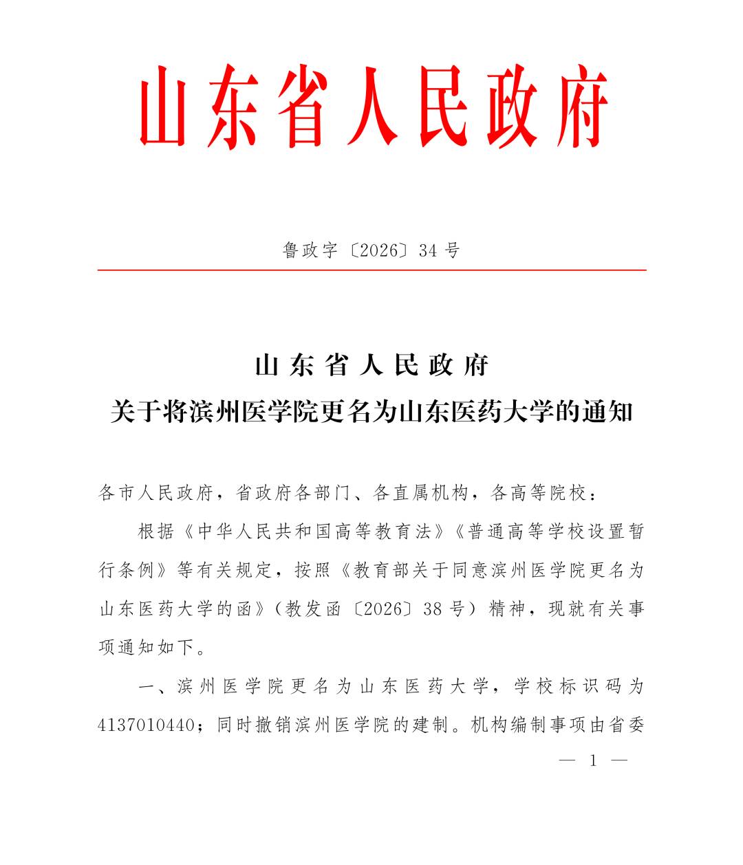 3月17日,根据《教育部关于同意滨州医学院更名为山东医药大学的函》(教发函〔2026〕38号),山东省人民政府印发《山东省人民政府关于将滨州医学院更名为山东医药大学的通知》(鲁政字〔2026〕34号),滨州医学院正式更名为山东医药大学。