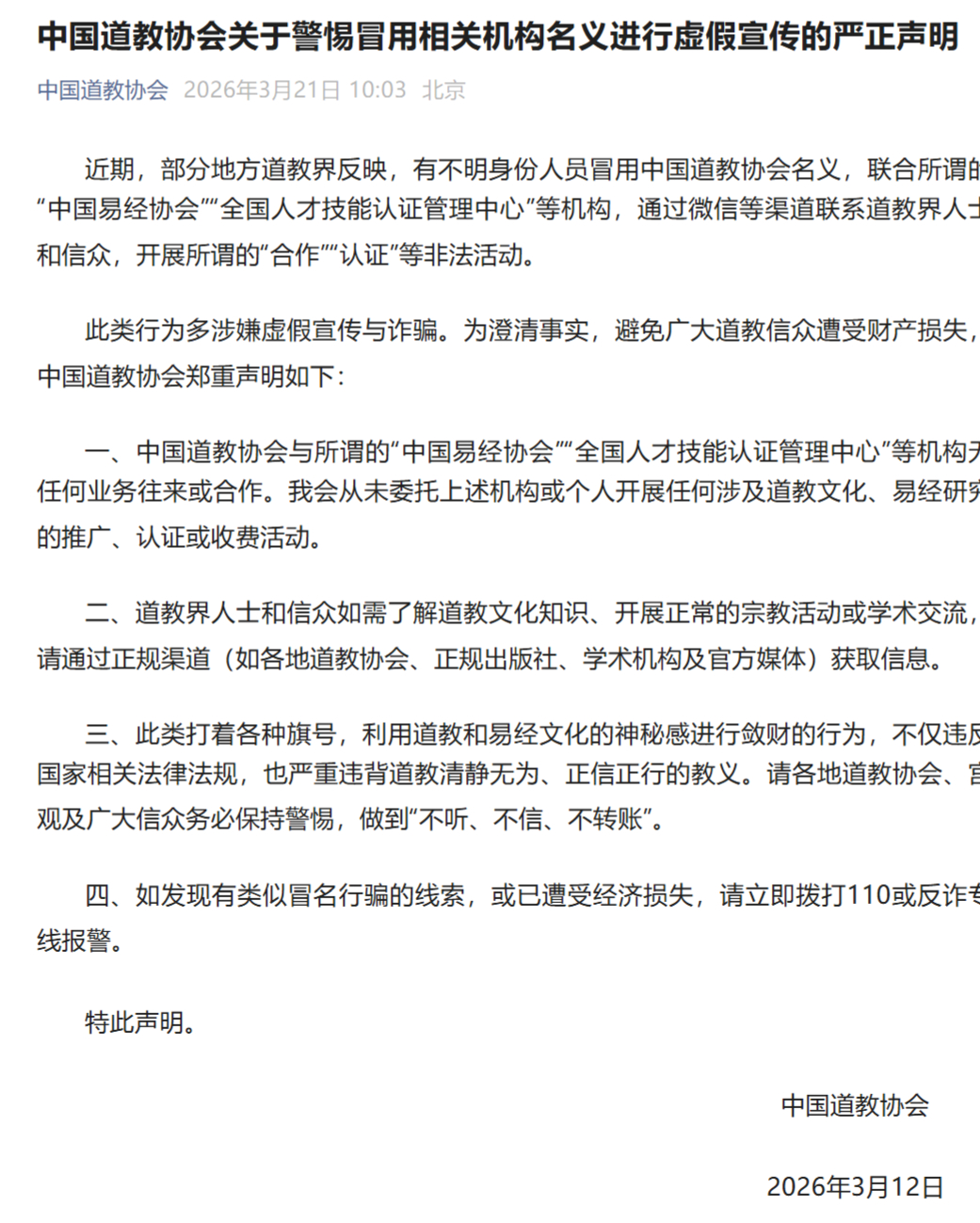 近日,中国道教协会通过微信公众号发布了《中国道教协会关于警惕冒用相关机构名义进行虚假宣传的严正声明》(以下简称“声明”)。