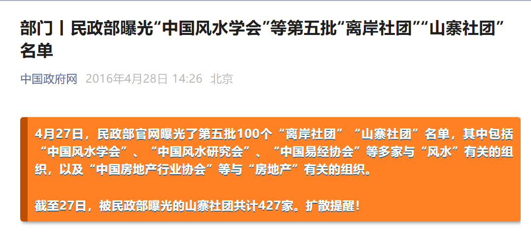 2016年4月27日,民政部官网曝光了第五批100个“离岸社团”“山寨社团”名单,其中包括“中国风水学会”“中国风水研究会”“中国易经协会”等多家与“风水”有关的组织。