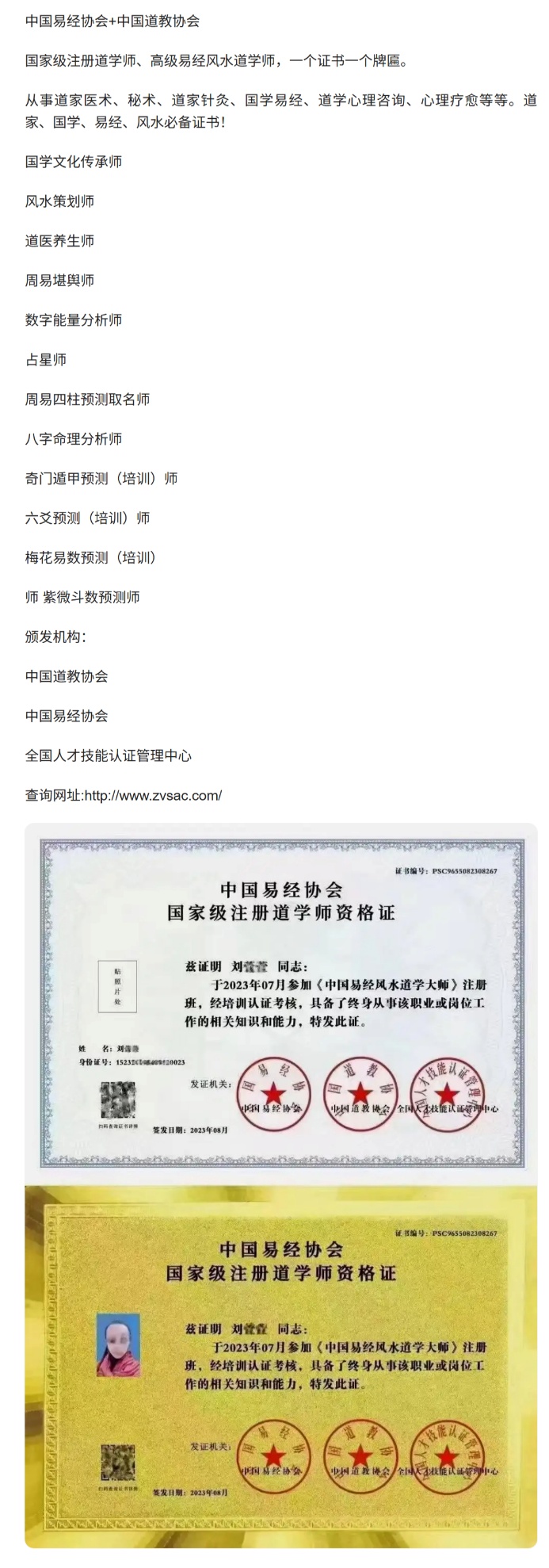 记者从网上查询到以所谓“中国易经协会+中国道教协会”名义出现的人才技能认证广告。