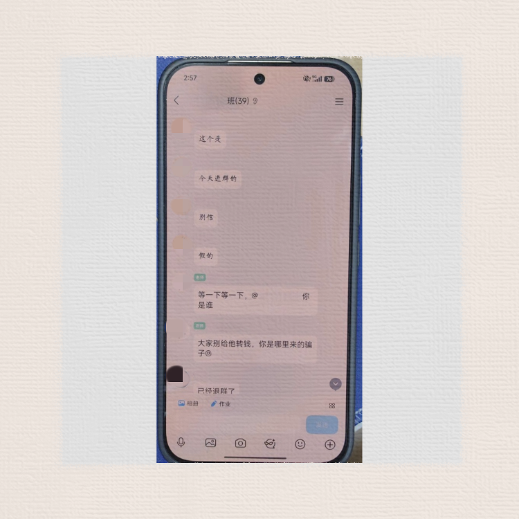 凡是在群里自称班主任、老师,以“资料费”“培训费”“教材费”等为由,让您扫码转账的,都是诈骗!