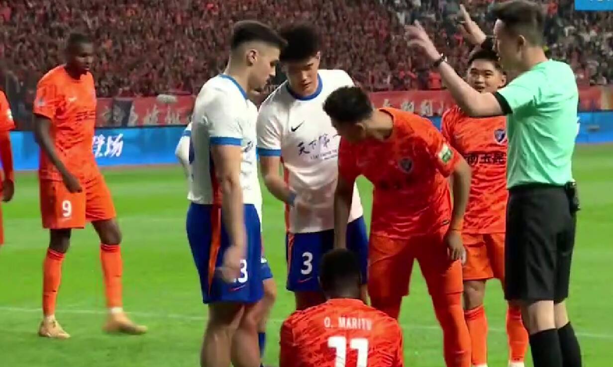 第83分钟,谢文能和出击的鲍亚雄撞在一块,被裁判直红罚下。第88分钟,奥斯卡禁区线上左侧做球,约尼查禁区左侧小角度挑射破门,泰山队0-4落后。