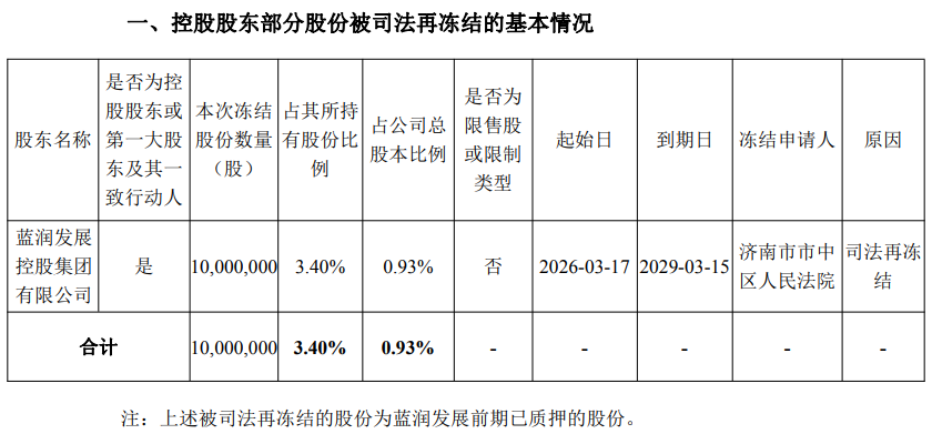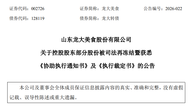 近日,山东龙大美食股份有限公司发布《关于控股股东部分股份被司法再冻结暨获悉 <协助执行通知书>及<执行裁定书>的公告》,近日获悉由山东省济南市市中区人民法院出具的《协助执行通知书》【(2026)鲁 0103 执 1102 号】及《执行 裁定书》【(2026)鲁 0103 执 1102 号】,获悉公司控股股东蓝润发展控股集团有限公司所持公司部分股份被司法冻结并将被强制执行卖出。其中显示,蓝润发展控股集团有限公司本次被冻结股份数量为1000万股,占其所持股份比例3.4%;占公司总股本比例0.93%。到期日为2029年3月15日。截至公告发布日,蓝润发展控股集团有限公司被冻结持股数量约为1751万股,占其所持股份比例5.96%,占公司总股本的1.62%。本次股权冻结的申请执行人为中泰证券股份有限公司,《协助执行通知书》中表述:变更可售冻结后卖出被执行人的上述证券,在达到 3628.7298 万元后停止卖出,并将卖出所得款项及资金账户内孳息解冻后一并扣划至我院账户。此前,龙大美食宣布,总经理杨晓初因工作调整辞去总经理职务,辞职后仍继续担任公司董事长及董事会战略委员会、提名委员会委员。
