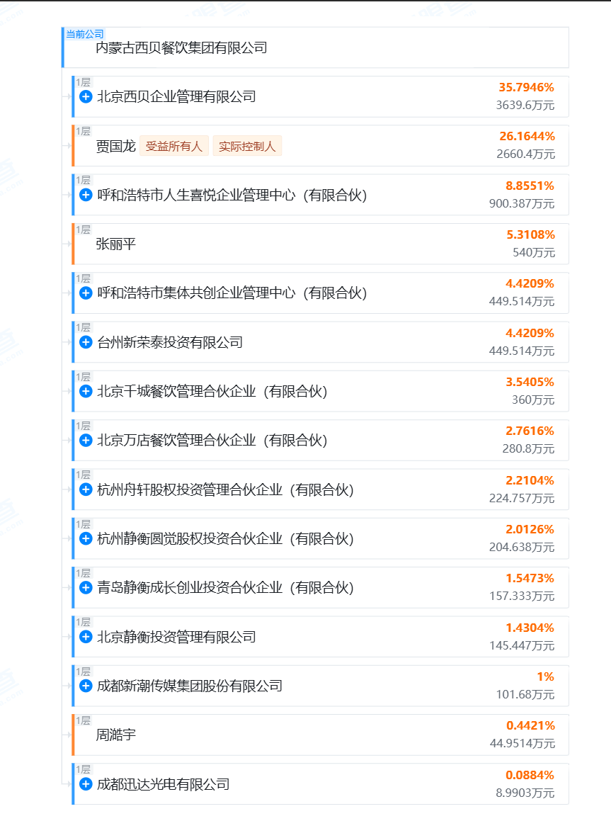 内蒙古西贝餐饮集团有限公司成立于2017年10月,法定代表人为贾国龙。据公示系统显示,西贝集团上一次投资人变更在2025年的9月。