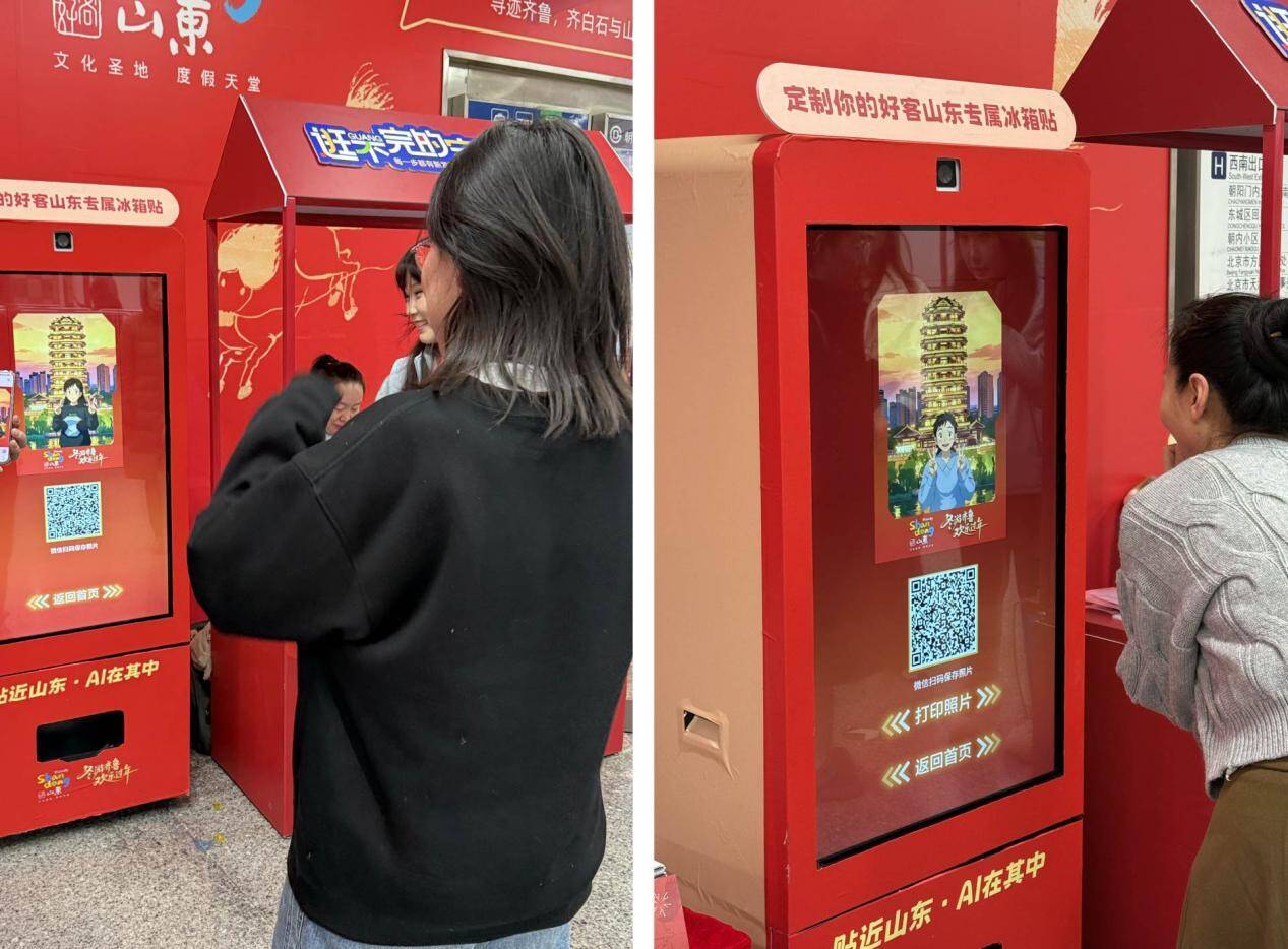 在“贴近山东,AI在其中”山东定制冰箱贴打印区,游客通过AI拍照与山东各地地标景观虚拟打卡合影,透过一个小小的冰箱贴,将富有特色的山东人文自然风景浓缩于方寸之间,把齐鲁大地的美好带回家。
