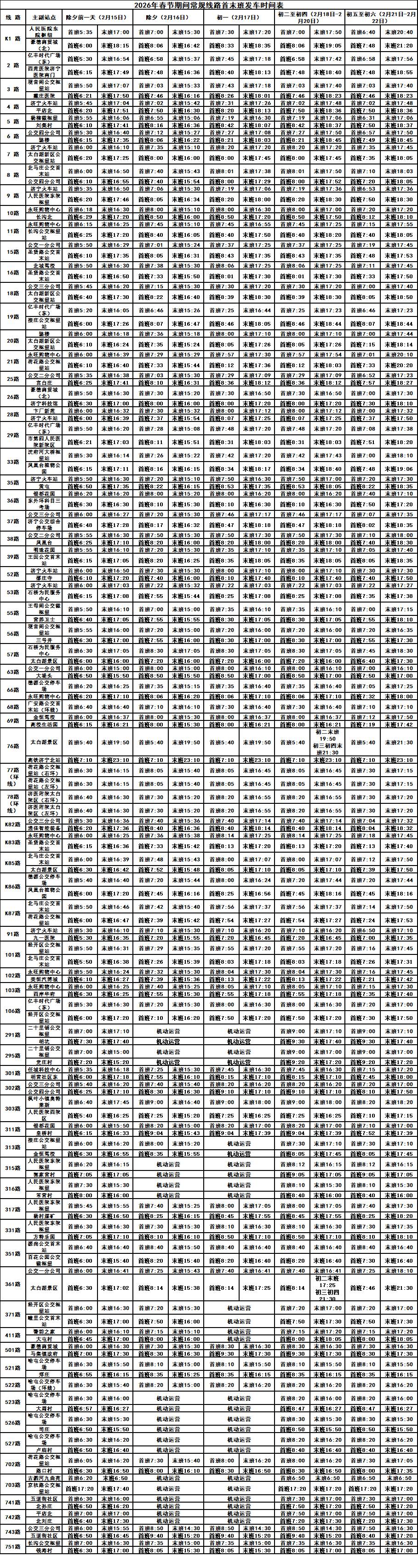 常规线路2月15日—2月22日(正月初六)执行春节期间运营计划(其2026年春节期间常规线路首末班发车时间见附表),2月23日(正月初七)恢复原有时间正常运行。