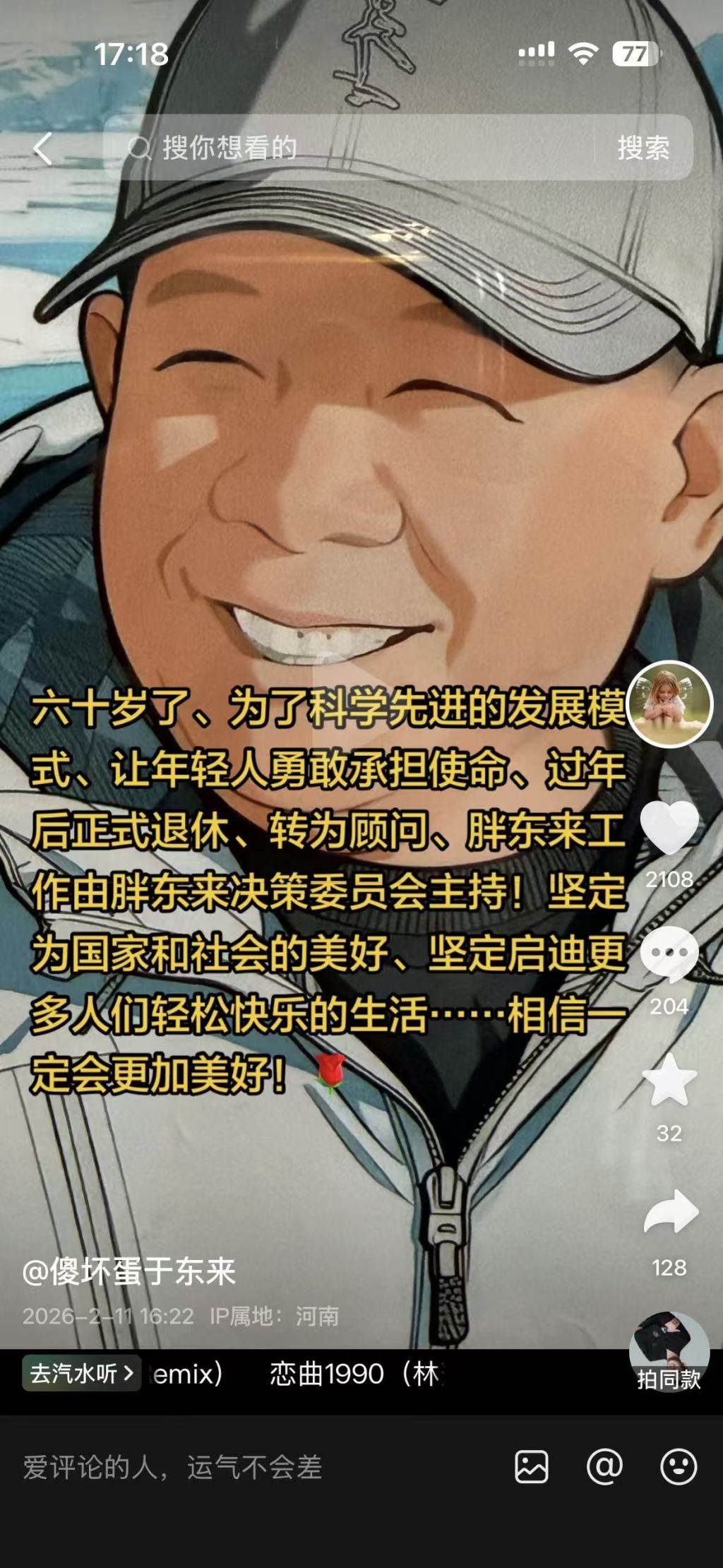 2月11日下午,胖东来创始人于东来在社媒上官宣“即将退休”。