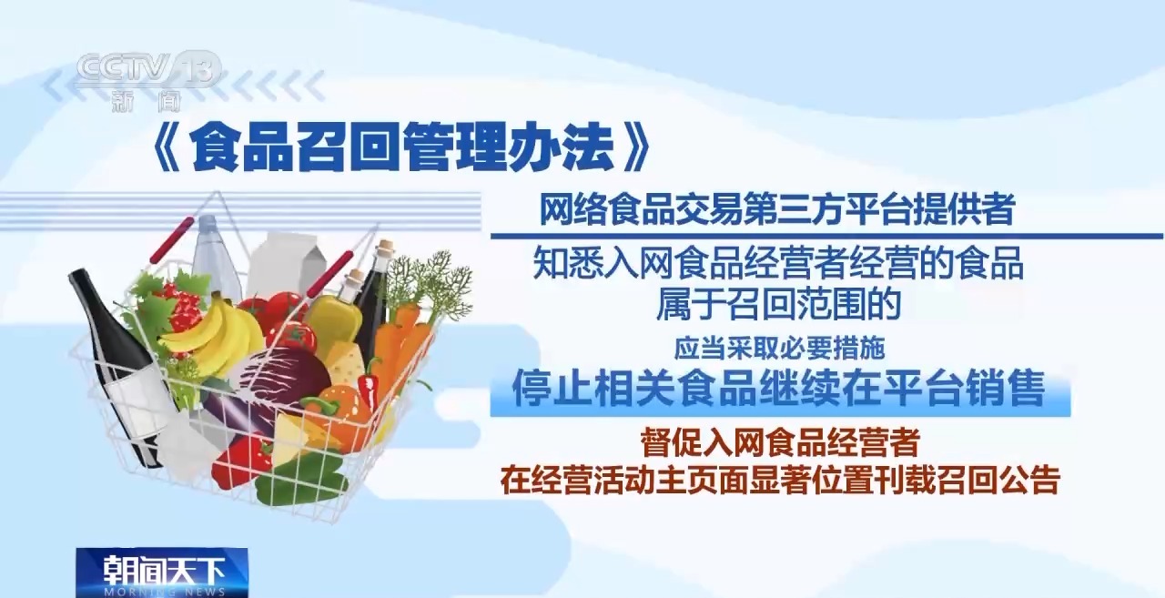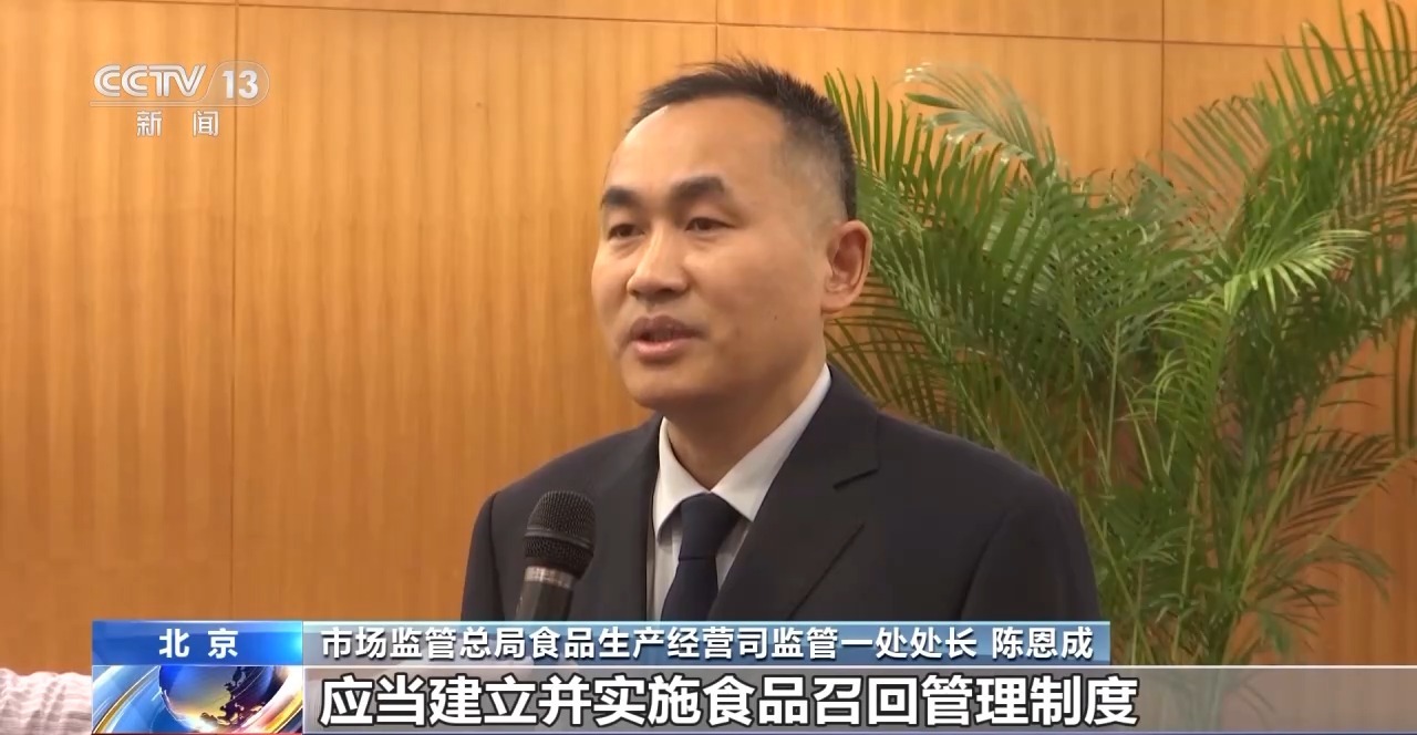 市场监管总局食品生产经营司监管一处处长 陈恩成:明确要求食品生产经营者建立并实施食品召回管理制度,规定食品经营者、集中交易市场开办者、柜台出租者、展销会举办者及网络平台提供者的配合召回义务。