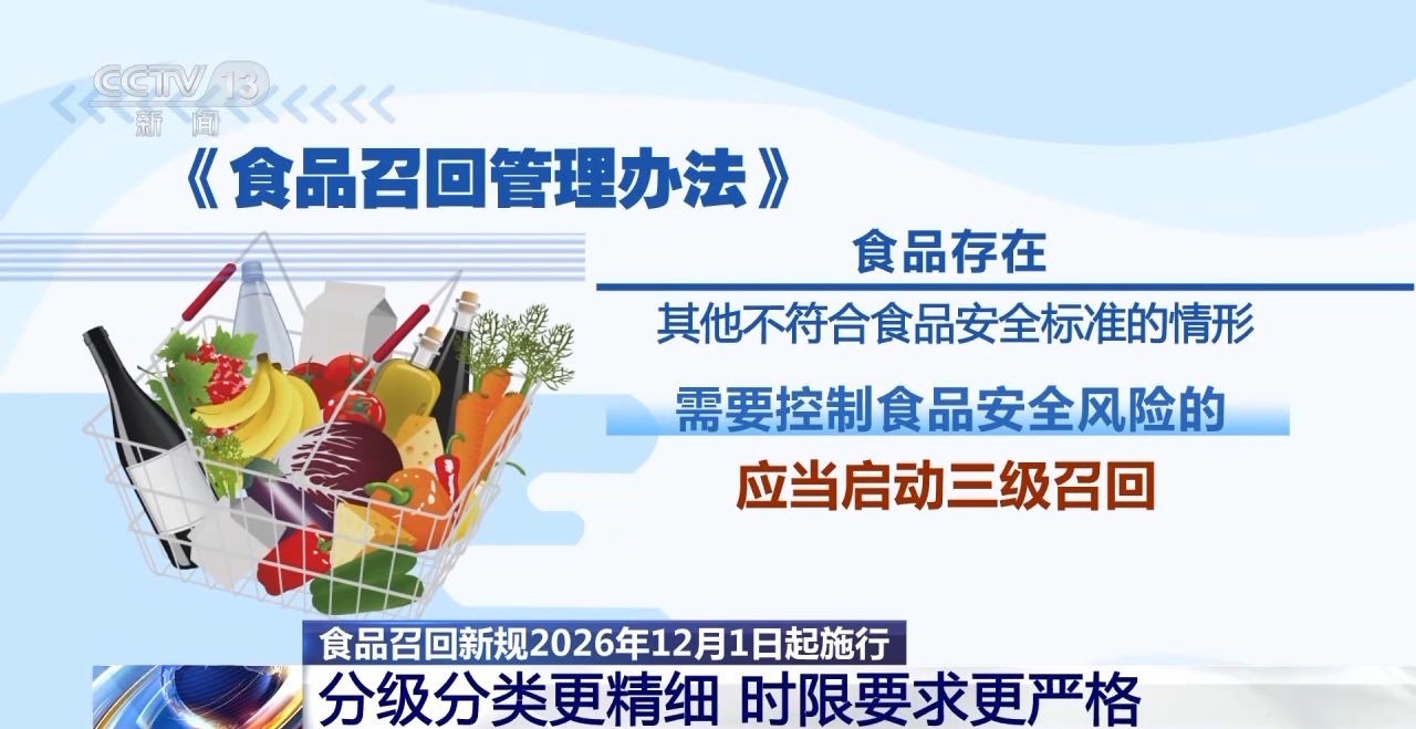 记者昨天(11日)从市场监管总局了解到,新修订的《食品召回管理办法》将于2026年12月1日起施行。