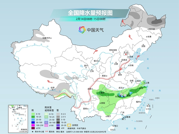 中央气象台预计,今天,新疆北部、西藏东部、川西高原南部等地部分地区有小雪或雨夹雪,其中,新疆北疆东部和沿天山地区等地部分地区有中到大雪;江南南部、贵州大部、广西大部、台湾岛东部等地部分地区有小雨。