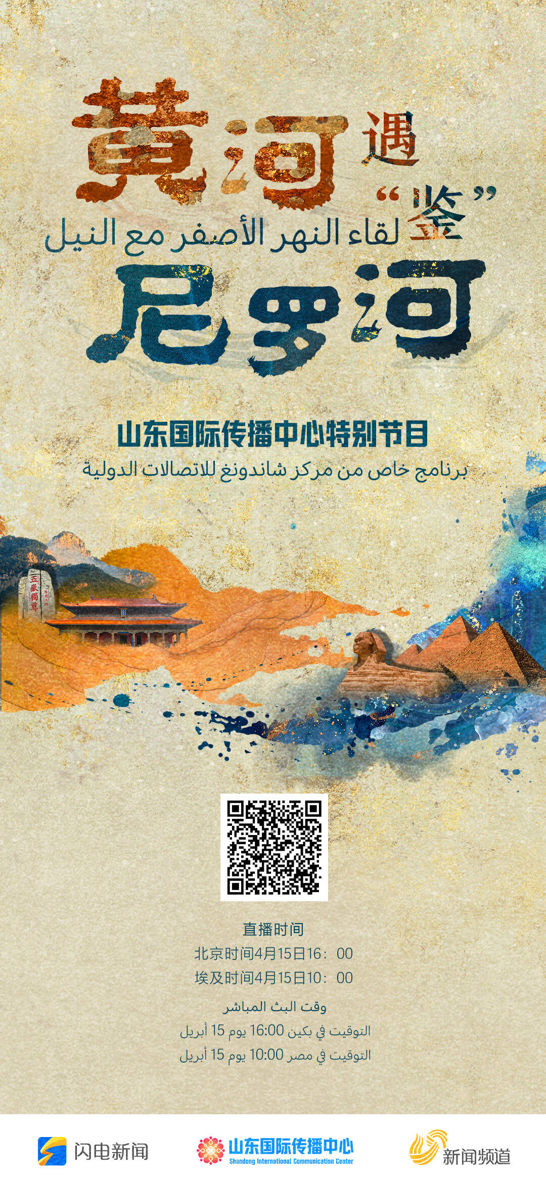 北京时间4月15日16:00,锁定山东国际传播中心视频号、闪电新闻客户端、山东电视新闻频道,见证黄河与尼罗河的“千年之约”,共赴一场中埃“老友记”。