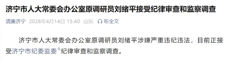 济宁市人大常委会办公室原调研员刘绪平涉嫌严重违纪违法,目前正接受济宁市纪委监委纪律审查和监察调查。