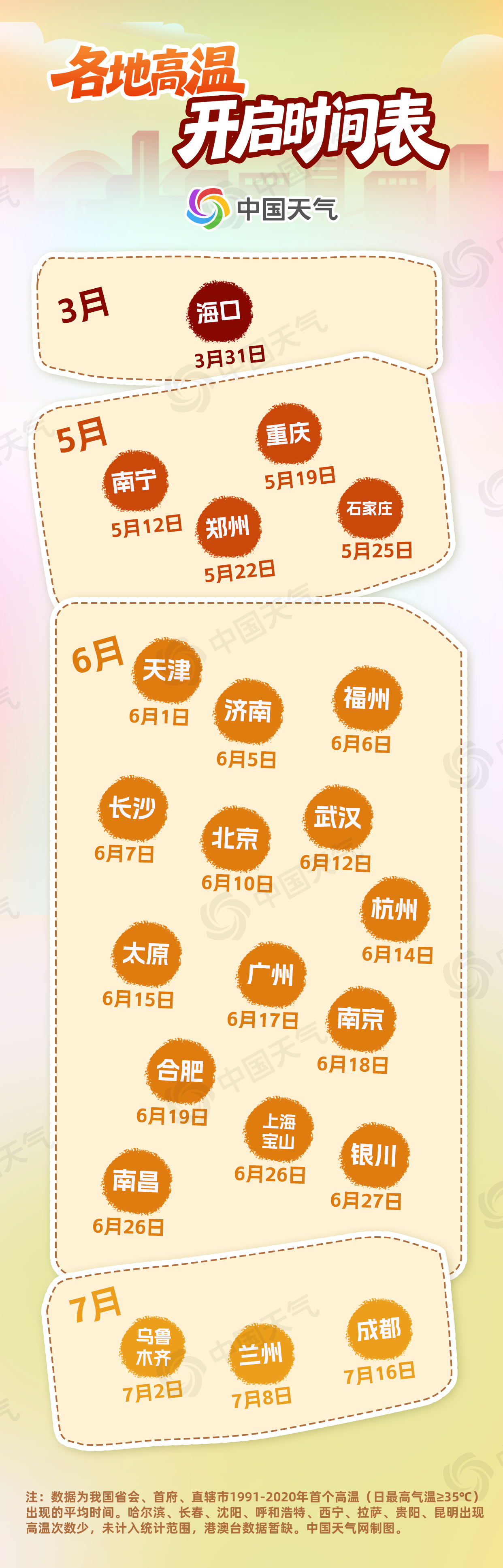 盘点了1991至2020年的气象大数据发现,在省会、首府、直辖市中,海口是最早出现高温的城市,通常高温在3月底就会早早到来,今年的高温季来得并不算早。南宁的首个高温日为5月12日,而同样属于华南的广州和福州则要等到6月份。