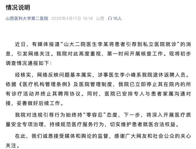 4月17日,山西医科大学第二医院发布情况说明,回应近日媒体报道“山大二院医生李某将患者引荐到私立医院就诊”一事。
