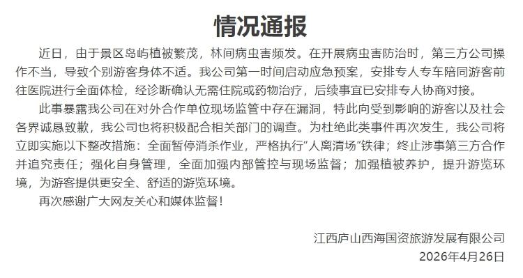 4月26日晚,江西庐山西海国资旅游发展有限公司发布情况通报,近日,由于景区岛屿植被繁茂,林间病虫害频发。在开展病虫害防治时,第三方公司操作不当,导致个别游客身体不适。我公司第一时间启动应急预案,安排专人专车陪同游客前往医院进行全面体检,经诊断确认无需住院或药物治疗,后续事宜已安排专人协商对接。