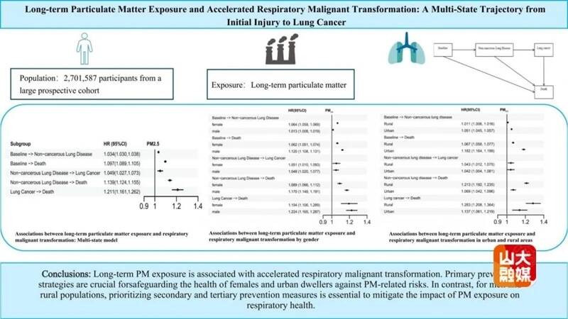 齐鲁网·闪电新闻3月24日讯 近日,山东大学公共卫生学院、国家健康医疗大数据研究院薛付忠教授团队王箐教授课题组,在大数据驱动的环境健康研究领域取得系列重要突破。研究团队依托覆盖山东省的齐鲁全生命周期电子健康研究型数据库(Cheeloo LEAD),围绕空气污染与呼吸系统健康、孕产妇健康两大方向开展研究,相关两项原创性成果发表在国际环境健康领域权威期刊Journal of Hazardous Materials(中国科学院1区,影响因子12.4),系统阐明了大气污染对特定人群健康风险的长期与急性影响,为相关健康问题的精准防控和环境健康政策制定提供了高水平科学依据。研究一:厘清长期颗粒物暴露加速呼吸系统恶性转化的全病程轨迹题为“Long-term particulate matter exposure and accelerated respiratory malignant transformation: A multi-state trajectory from initial injury to lung cancer”的研究,首次清晰描绘出长期颗粒物暴露推动呼吸系统疾病从“基线健康”到“非癌性肺病”、再到“肺癌发生”、最终走向“死亡”的完整恶性转化链条。该研究基于山东省270万成年人的7年随访数据,证实颗粒物暴露不仅会提升呼吸系统疾病的发病风险,还会加快疾病的发展转化进程。同时研究发现明显的人口学差异:女性和城市居民对PM2.5引发的肺病发病更为敏感,而男性和农村居民在PM2.5相关肺病的致死风险上,表现出更高的易感性。