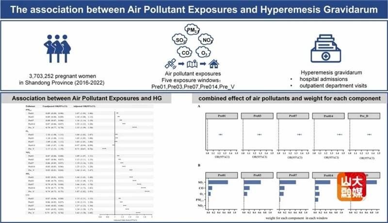 与北京大学的李钦副研究员团队合作题为“The association between air pollutant exposures and hyperemesis Gravidarum” 的研究,首次在大规模人群层面,系统评估了孕期暴露于多种空气污染物与妊娠剧吐发病风险的关联,并识别出相关关键影响因素。该研究纳入山东省370余万名孕妇的相关数据,结果显示,孕期暴露于多种空气污染物,均与妊娠剧吐风险呈显著正相关,其中二氧化硫(SO2)的关联度最强,是首要影响因素。分层分析还发现,20-25岁的年轻孕妇,对空气污染带来的不良影响更为敏感。