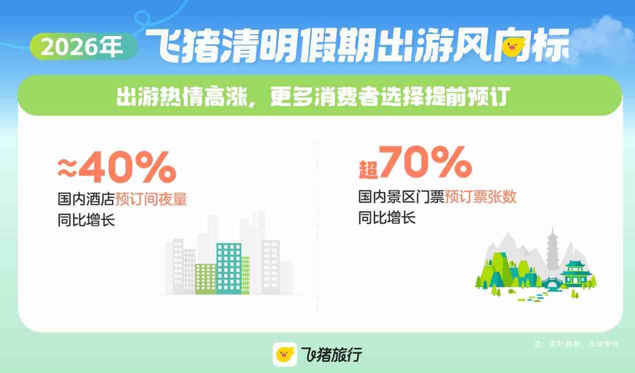 临近清明假期,旅游预订迎来春季高峰。3月26日,飞猪发布《2026清明假期出游风向标》,报告显示,截至目前飞猪清明假期旅游预订量较去年同期强劲增长。其中,国内酒店预订间夜量同比增长约40%,国内景区门票的预订票张数同比增长超70%。