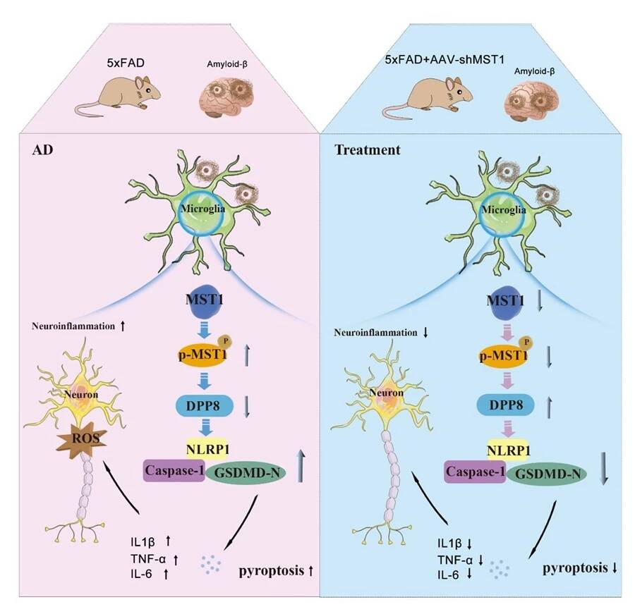 阿尔茨海默病(Alzheimer’s disease,AD)是一种常见的神经系统退行性疾病,其特征是β淀粉样蛋白(Aβ)诱导的大脑稳态破坏,导致神经元损伤和认知障碍。近年来,小胶质细胞驱动的神经炎症被认为是推动AD进展的关键环节,然而,相关分子机制仍有待进一步阐明。哺乳动物Ste20样激酶1(MST1)在细胞凋亡、免疫炎症和氧化应激中发挥的关键调控作用备受关注。作者前期研究结果发现MST1激活可通过调控mtDNA和氧化应激参与AD的进展(本部分研究成果已发表)。在这项研究中,本团队在阿尔茨海默病患者外周血、5xFAD小鼠血清以及其海马和皮层脑组织中检测到MST1的活化形式p-MST1水平显著升高,并发现其与慢性炎症刺激条件下小胶质细胞发生的焦亡密切相关。进一步研究表明,在5xFAD小鼠海马和皮层组织中敲低MST1能够显著改善认知功能缺陷,降低磷酸化Tau蛋白水平,同时减轻神经退行性损伤和脑内炎症反应。分子通路研究显示,MST1通过调控DPP8蛋白表达,进而影响NLRP1/Caspase-1/GSDMD-N信号通路,抑制小胶质细胞焦亡并缓解神经免疫炎症。