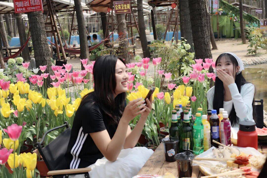 🌸 双花海打卡 · 📸 郁金香花田:推荐“开往春天的火车”打卡框 · 📸 绣球花海:推荐“莫奈花园镜面装置” · 📸 露营区:推荐“落日秋千”