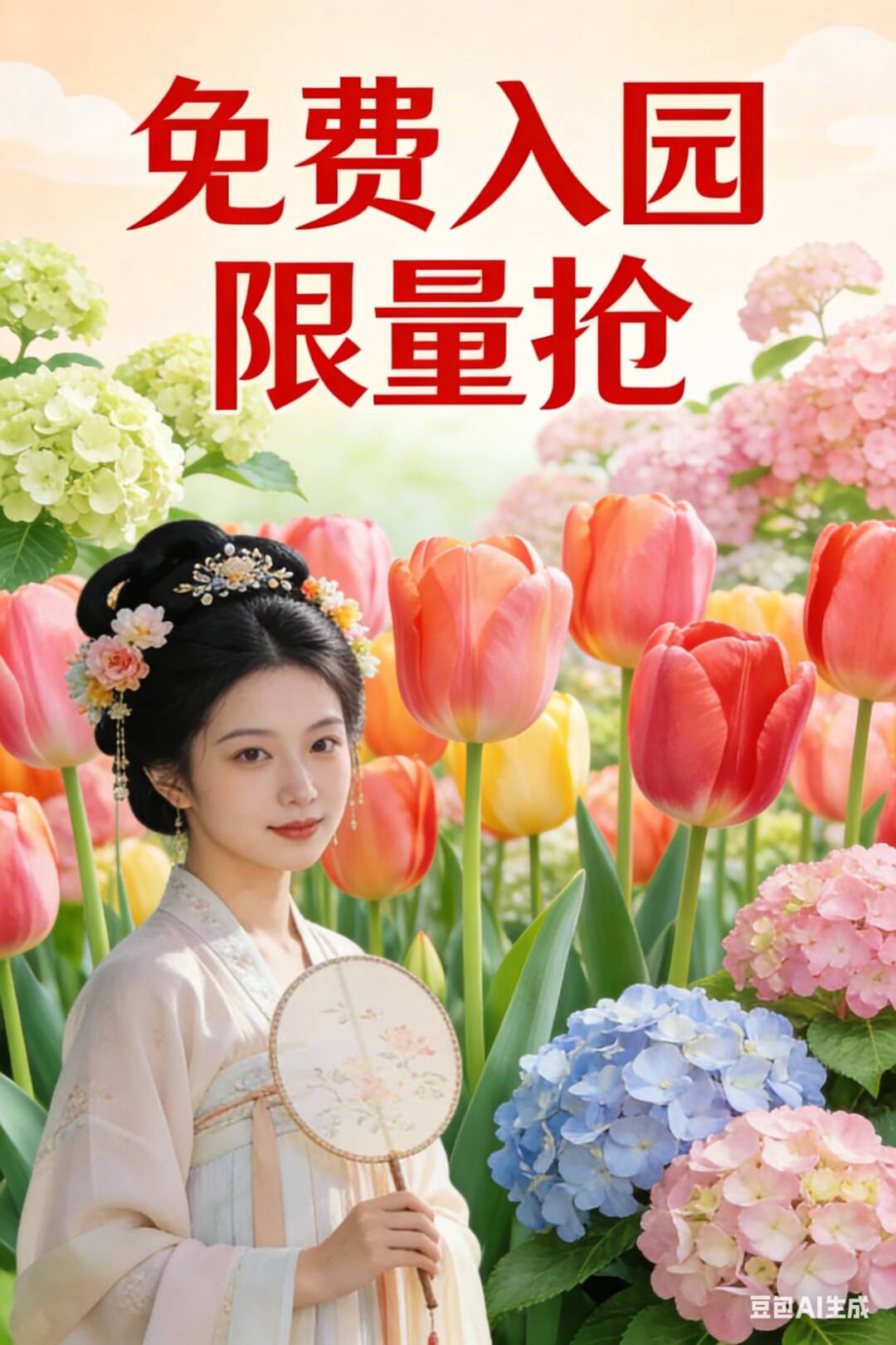 🌸 花神巡游 每天三场:10:30 / 13:30 / 16:30 郁金香仙子与绣球花神在花海中巡游,可合影、可互动、可簪花,氛围感拉满。
