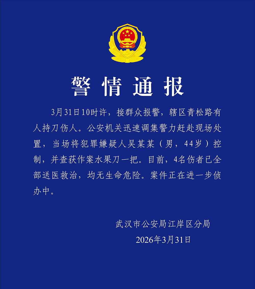 武汉公安通报一起持刀伤人案:4名伤者均无生命危险