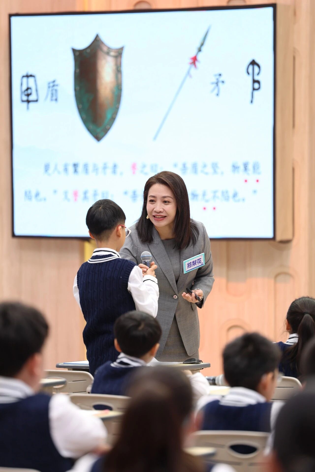 来自深圳南山外国语学校香山里小学的郑梨花老师直面教学难点,带来五年级下册《自相矛盾》,以先秦寓言为切入点,从楚人卖矛与盾的荒诞场景切入,引导学生通过默读批注、重音朗读、情境思辨,在文本解读与互动探讨中领悟“说话留余地” 的表达智慧,更延伸至《韩非子》原著语境,挖掘寓言背后反驳君主事必躬亲的深层内涵,让学生学会直面矛盾、化解矛盾的思维方式。