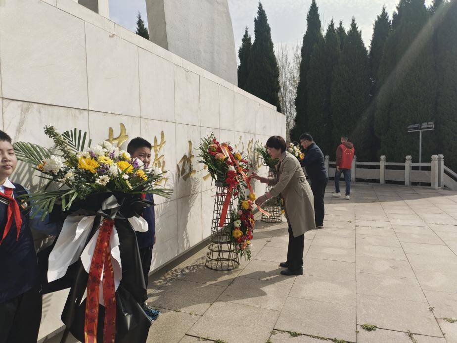 上午9时,祭扫仪式正式开始。松柏苍翠,丰碑矗立。全体人员肃立默哀,悼念革命先烈,缅怀他们为民族独立、人民解放浴血奋战、英勇献身的光辉事迹。默哀毕,退役军人志愿者代表与少先队员代表,将精心准备的花篮缓缓敬献至纪念碑前,口镇街道民生服务保障中心负责人与学校领导共同整理花篮。随后,全体人员怀着崇敬的心情,有序瞻仰吐丝口战役纪念碑,感悟先烈们不畏牺牲、奋勇拼搏的革命精神。