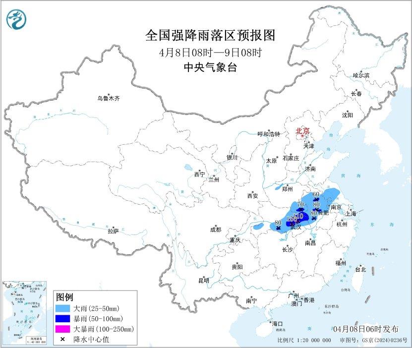 中央气象台4月8日6时发布暴雨蓝色预警: