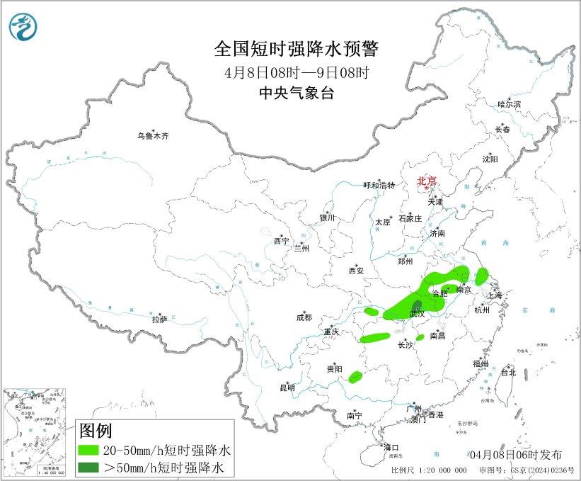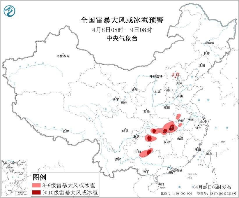 预计4月8日8时至9日8时,江汉、江淮西部、江南北部、西南地区东部等地的部分地区将有8级以上雷暴大风或冰雹天气,其中,湖北东部和南部、湖南西部、重庆东南部、贵州东南部等地的部分地区将有10级以上雷暴大风,最大风力可达11级以上;湖北东部和南部、安徽中北部、江苏中部、河南南部、湖南北部等地的部分地区将有小时雨量大于20毫米的短时强降水天气,其中,湖北东部局地小时雨量大于50毫米。