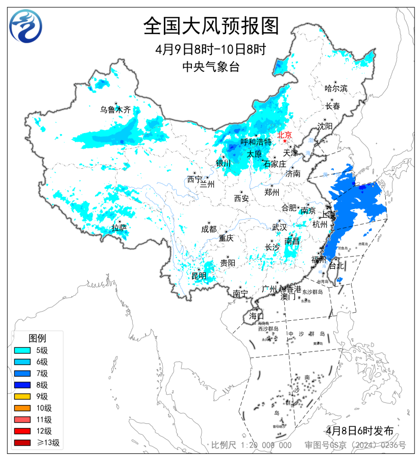 预计,4月8日8时至9日8时,新疆东部和南疆盆地、内蒙古、甘肃东部、宁夏北部、吉林中西部、辽宁北部以及西藏大部、川西高原、云南、贵州等地部分地区有5~7级风,阵风8~9级;黄海中部和南部海域、东海西北部海域有7级风,阵风8级。
